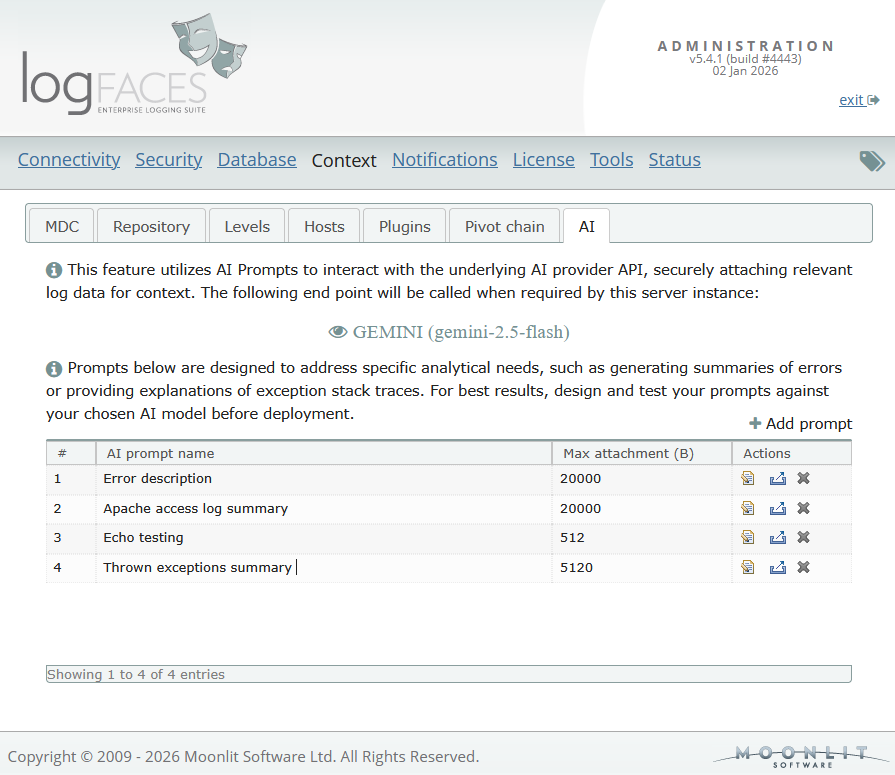 - Custom AI Prompts: We’ve introduced a prompt administration. You can now design and store environment-specific prompts—such as "Exception Analyzer" or "Daily Summary"—tailored to your specific stack. These prompts are sent to your chosen AI provider alongside relevant logs.